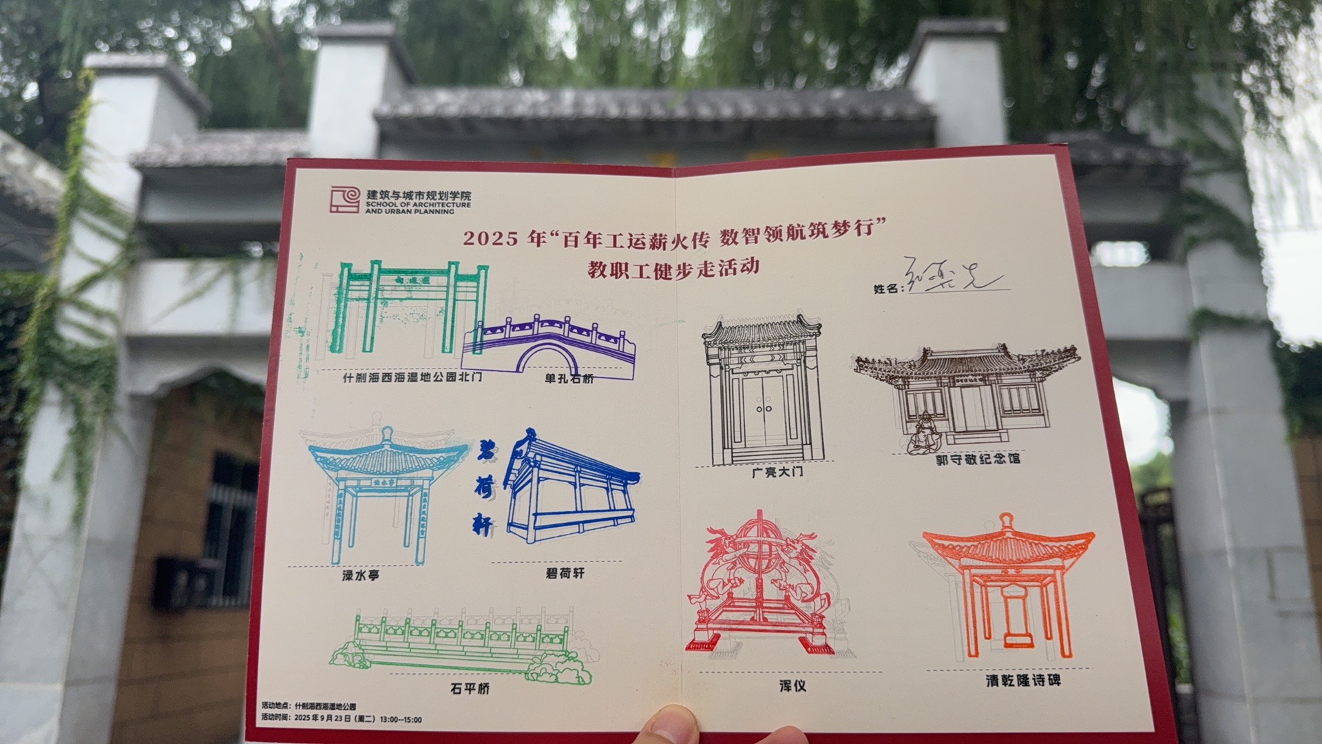 秋高气爽,西海湿地公园景色如画。活动中特别设置了9个融合自然与人文的特色打卡点,包括历史悠久的单孔石桥、清雅别致的渌水亭、意境优美的碧荷轩以及具有深厚文化底蕴的郭守敬纪念馆和乾隆诗碑等。参与活动的教职工们手持精心设计的集印卡片,沿着预定路线健步前行,在锻炼身体的同时,也领略了公园内丰富的人文景观。在每个打卡点,大家不仅能够收集独具特色的主题印章,还能驻足参观,了解相关历史文化背景,感受自然与人文的和谐共生。