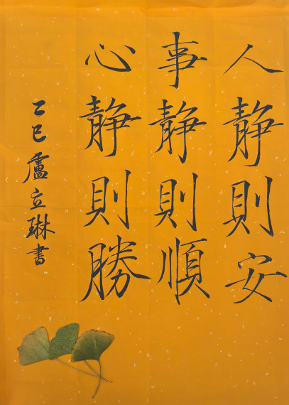 活动筹备阶段,书法社的同学们挥毫泼墨,将“心静则明”“相信自己”等温柔寄语书写在橘黄宣纸上,或娟秀灵动,或苍劲有力,为活动奠定了雅致基调;心联会的同学们则收集梧桐、银杏、红枫等各色落叶,与书法作品一同装点场地